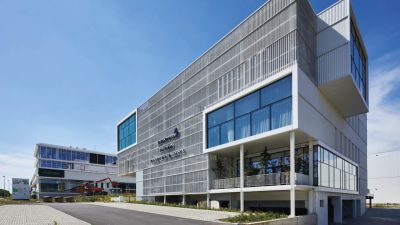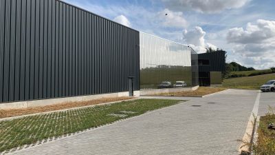 Tekst: To allow production to be expanded from five to eight lines, the Zoetis plant in the Louvain-la-Neuve science park has been enlarged by a 2,500 m² extension in a similar style to the existing building. Despite spans of almost 40 metres, there are virtually no supporting columns on the ground floor. The building features three storeys: the ground floor housing the production unit, a technical mezzanine floor for circulation, and a storey under the roof, where the building services are located. The latter is integrated into the space between the roof beams in a square block. The supporting structure consists of rolled S235 sections for the edges of the trusses, floor beams and columns, and S355 sections for the diagonals of the trusses (to minimise their diameter). The steel skeleton weighs approximately 250 tonnes and the extension took around a year to build.