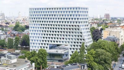 Tekst: The new provincial government building in Antwerp is a compact and sustainable construction with its own unique identity. Solidly built, but with an elegant twisted shape and distinctive triangular windows, the tower stands out against the sky but blends in beautifully with the surrounding greenery. The congress hall, auditorium and foyer are in the base of the building, half below and half above ground, and the office block has been erected on top of this transverse section like a bridge over the roof terrace. This fourteen-storey tower has twisted design that immediately catches the eye. The congress building, designed around a steel frame, has an open floor plan with large column-free spans – just what is needed for the meeting rooms, auditorium and exhibition hall. A graceful yet eye-catching steel staircase connects the different levels. On the fourth and fifth floors of the tower, three steel trusses span the low-rise conference building beneath, whilst the outer trusses are embedded in the concrete and follow the twisted contours of the building.