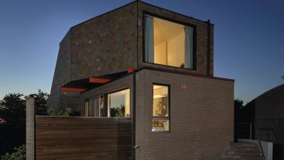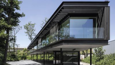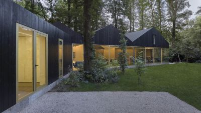 Tekst: This former wooden chalet has been transformed into a fully-fledged contemporary single-family dwelling by the addition of an extension designed around the positioning of the surrounding oak trees. A steel skeleton forms the basic structure of the extension spaces to the left and right of the existing chalet. This is clad with sandwich panels in the wall and roof zones and then finished to a high standard with plasterboard (interior) and black oiled timber (exterior) cladding to give a refined appearance. Near the gold-coloured anodised facade, a steel truss structure was placed on slender supports to underpin the old floor and roof structure and to accommodate the new facade surface with roof spans. The steel structure incorporates around 7 tonnes of S235JR steel in sections including HE 140 A, HE 140 B, IPE270 and 50 x 120 flat steel.