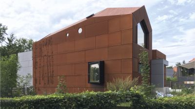 Tekst: A tearoom on the edge of the Zoete Waters in Oud-Heverlee dating back to the 1950s has been given a new lease of life as a wellness centre and luxury holiday home. The existing building was topped with steel porticos and wooden joinery before being clad with weather-resistant steel. Near the bedrooms, the weatherproof steel cladding features a specific perforation pattern that allows light to enter without compromising privacy, whilst also emphasizing the geometry of the building. An image of a birch forest has been laser cut onto the side, behind which the ventilation facilities are hidden. Because of the weight of the addition, combined with the fact that the existing bungalow had weak foundations and lightweight load-bearing walls, the superstructure is made of HEA-section steel gantries. The weatherproof steel blends in perfectly with the surrounding nature and ensures seamless integration into the landscape.