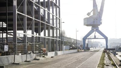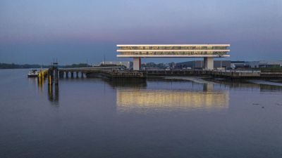 Tekst: Over the past few years, the former shipyard of Boelwerf on the De Zaat industrial site in Temse has been transformed into the new company site for Cordeel’s Temse base. The move has been a gradual transition, with a few departmental buildings being the first to be built on the 20 hectare site and the new head office putting the final piece in place. The beam-shaped building spans the former dry dock, which is strategically located on a side arm of the Scheldt. Steel, glass, reflective facade panels and boundless ambition are the ingredients making up this constructive gem. The main 11 m high building – a 108 m long structure in S355 steel consisting of two 10 m high trusses supplemented by crossbeams with cantilevers made of H-sections – rests on four steel legs around which concrete cores have been erected. The underside of the building is 14 m above ground level, so Cordeel employees can enjoy a panoramic 360° view from wherever they happen to be.
