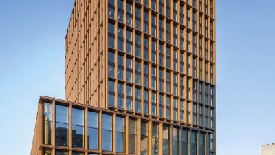 Tekst: 70 St Mary Axe, known informally as the ‘Can of Ham’ because of its curved shape, is an office building in the City of London. Rising to a height of 90 m, it has 24 storeys and a footprint of 48 x 40 m. The load-bearing steel structure of columns and floor beams is built around a concrete core that houses all the pipes, lifts and stairs, and the steel skeleton contains almost 3,000 tonnes of grade S355 steel. The columns are a combination of UC profiles and UCs with welded-on plates; floor beams are either welded-together sheet steel girders or UC profiles. The construction technique selected for the floor – the 33,000 m² floor plates are made of 0.89 mm galvanised steel profiled sheets filled with lightweight concrete – meant that it could be walked on within a week. Each floor comprises an average of 100 structural steel elements that took on average 1.5 weeks to assemble per floor. The roof structure is made up of 5 curved composite profiles.