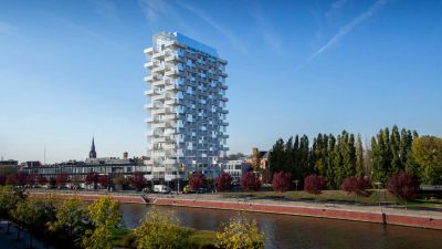 Tekst: With an above-ground floor area of 11,348 m², including 1,858 m² of terraces, the K-Tower in Kortrijk has a very compact footprint of 480 m² but still manages to accommodate 65 apartments spread across 22 floors. Thanks to the flexible layout of each floor, the various orientations of each apartment and the large, alternating, double-height terraces, all the residential units enjoy abundant sunshine, plenty of natural light and magnificent panoramic views. The tower is eye-catching, but its reflective patchwork makes it blend into the skyline. Clad in perforated sheet metal (58% perforation, S235 and S355 grades), it reflects the sunlight, giving it a subtle radiance that stops it from being too intrusive or dominant a part of Kortrijk’s horizon. An additional advantage of the white, reflective cladding is that the facade of the K-Tower is constantly evolving and guarantees a gradual transition between the large urban scale and the more human dimensions of the landscape that stretches out around it.