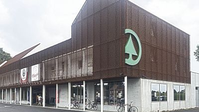 Tekst: An existing supermarket and two adjacent houses have been demolished and replaced by a new supermarket plus a restaurant and apartments. To maximise the useful height in the supermarket whilst complying with urban development regulations, steel roof girders were installed above the ground floor. These comprised HE 300 B sections of S235 steel on concrete columns with steel decking, hyperstatically constructed with three approximately 18 m spans, 5 m apart. The columns and beams of the front facade are also made of steel. Finally, the roof and facade of the apartments were finished in weatherproof steel, and the passage on the front of the upper levels in perforated weatherproof steel panels. The weatherproof steel is mounted on steel columns and girders via a steel substructure. A total of 83 tonnes of structural steel was used in this project.