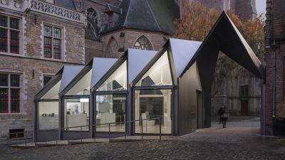 Tekst: The reception pavilion of the Gruuthuse Museum in Bruges is centrally located between the Church of Our Lady, the Gruuthuse Palace and the Stone Museum. It re-encloses the centuries-old ‘court’ and draws the site back together to form a historical whole. In this context of exceptional heritage value, the pavilion is a thoroughly contemporary construction – an exoskeleton of steel and glass – that still manages to echo the formal gothic and neogothic language of the surrounding monuments. It is designed as a folded steel structure, based upon the structural principle of the folded plate, with roof surfaces made of 6 mm flat steel and columns of 8 mm flat steel. The larger inclined surfaces of the canopy are locally stiffened with 10 mm thick welded fins whilst the vertical end surfaces take the rigidity they need from IPE 100 ribs. The elaborate detailing of the steel structure enhances the architectural expressiveness of the construction.
