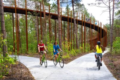 Tekst: The old water tower in the Warandeduinen nature reserve was due for a thorough renovation, but it was still performing its original function of providing drinking water to a large part of Middelkerke. Since the region could not do without its water supply, the base was left in place, allowing the pumping station to keep on operating. In the new design, nature, sand and wind are given free rein, with a raised wooden boardwalk that transitions into a bridge limiting the impact at ground level. A new structure has been added on top of the retained base, in which an eye-catching bundle of tubes winds its way around a spiral staircase. This array of galvanized and lacquered tubes is a reference to the area’s characteristic marram grass. The blades support the spiral staircase, a rest platform and a 20 m high panoramic platform. The use of steel gave rise to light open structures that contrast nicely with the existing solid base. It also meant that the structure could be prefabricated, allowing work in the protected dune area to be kept to a minimum.