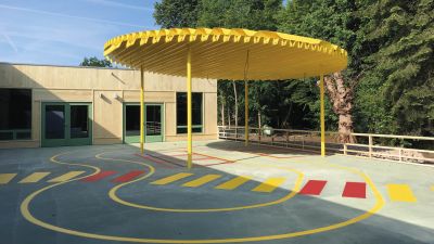 Tekst: De Leerexpert in Brasschaat is a school for children with both motor and learning disabilities. The brief was to renovate a run-down 1950s building and add a new wing. This will be positioned diagonally across the park garden and break the old school completely open. The central yellow canopy plays a crucial role in the playground for the less mobile children. It consists of a circular canopy that adds structure to the play area. The outdoor space for the slightly more independent young adults faces the park. Its canopy suggests a panoramic transitional space between inside and outside. Both canopies – including columns, beams and profiled sheets – are made entirely of steel. The roof plane of the yellow canopy is composed of warm roof cladding bracketed together. Four slender columns carry shorter beams. The orange canopy again consists solely of columns and a roof. The connecting beam is mounted at the top and not visually prominent.