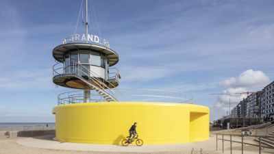 Tekst: From the Lichttorenplein on the Knokke dike, it’s easy for passers-by to notice the raised lifeguard’s nest but overlook the brightly coloured structure beneath it. Although the coastal town of Knokke in West Flanders initially requested a safety pavilion on the dike, the architects stuck to their guns and insisted on a beach location. The 17 m diameter yellow shape is reminiscent of a buoy, but there’s more to it than a rescue centre. The positioning of separate spaces for the coordination and first aid rooms, the public toilets and the interview room with staff kitchen and toilets creates a public passageway or internal street that anyone can simply wander into. Like the lifeguard’s nest, the entire primary supporting structure of the bottom part is made of steel. This is supplemented by a timber construction and fibre cement panels and finished with polurea. The lifeguard’s nest sits on a hollow central tube (660 x 40 mm) that absorbs all wind loads and protects the pipework between nest and pavilion.