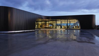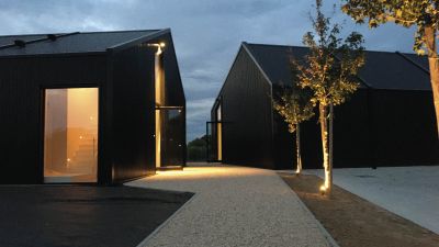 Tekst: The ‘Gloire de Duras’ wine estate lies in the heart of the Belgian Haspengouw region and was originally created as an extension of a family fruit farm. The estate was looking for a contemporary design language for its wine tasting pavilion and production building. The angled positioning of the two buildings leads the access path to the estate to a funnel-shaped space that gradually reveals a view of the vineyard beyond, whilst the choice of steel as a construction material made it possible to build on the agricultural character of the site and to tie in with the existing shed. It also allowed optimal functionality to be combined with a contemporary design language that is simple, robust, characterful and elegant all at the same time. This manifests itself in two austere black buildings with an asymmetrical roof profile in which roof and facade are both completely covered with vertically ribbed steel plate. The self-supporting under-roof sheets and wind bracing used in the facades and roof remain visible from inside.