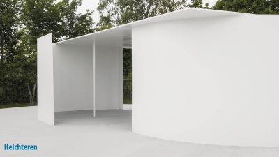 Tekst: The municipality of Houthalen wanted to build a place of farewell on each of the two Houthalen-Helchteren cemeteries. The winning design is pared right back to the essentials: a roof, columns and two walls, all made of steel and finished with two-component paint. Both of the farewell rooms are built on a concrete surface, and the chapel itself is a simple arrangement of a few slender columns, a roof and two walls in white painted steel. The curved shapes in the walls provide the building as a whole with rigidity, but also shift the roof in relation to the walls, creating openings that give the sunlight free rein to dapple the rounded walls with an ever-changing interplay of shadow drawings. The choice of steel makes the construction extra slender and gives it a delicacy that – together with the white colour – lends a sense of lightness that contrasts with the heavy emotion of saying goodbye.