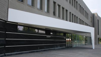 Tekst: The construction of a new school building for the Royal Athenaeum of Ans in the Belgian village of Alleur was accompanied by the installation of a large, strikingly shaped steel canopy, 20 metres long by 4.5 metres wide, and with an imposing mass that subtly culminates in a single support. The horizontal and vertical parts of the canopy (the roof and support respectively) are designed as a single geometry with – thanks to the concealment of assembly points, rainwater collection and drainage – an austere and almost abstract appearance. The dimensioning of the canopy is based on the principle of a welded steel portico in which the rod that serves as the canopy edge doubles up as the load-absorbing girder. This rod rests upon a variable cross-section column housing the rainwater drain and attached using invisible bolts. The white coating lends presence to the structure, whilst at the same time imbuing it with it a certain lightness.