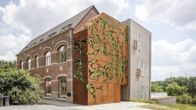 Tekst: Since the Grote Schijn pumping station is such an eye-catching feature of the landscape near the Antwerp ring road and cycle path, a decision was made to clad it in Corten steel expanded metal. To enhance the effect still further, Corten steel was also used for the surrounding fencing and two entrance gates. The main building was first fitted with a supporting structure or skeleton weighing approximately 35 tonnes and made of steel girders that had first been hot-dip galvanized and then powder coated in brown. The side walls and roof were then clad with Corten steel cassettes. Along the side of the jacks and the back, both the girders of the supporting structure and the cassettes were rounded off to increase architectural impact, and eight panel doors made of expanded metal were fitted to conceal the doors in the concrete building. Including the fencing and the gates, a total of around 1,400 m² of expanded metal was fitted.