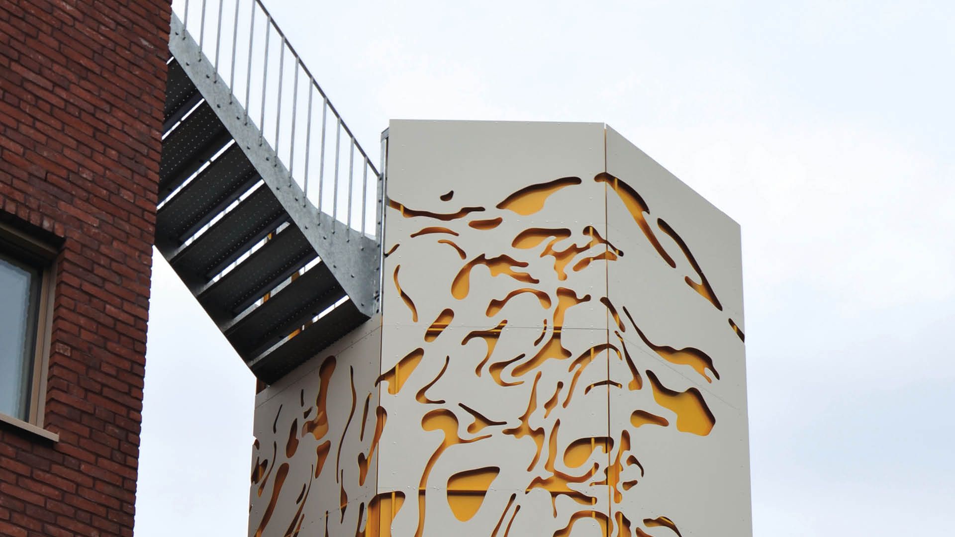Dans cette sculpture, le ‘blob’ typique, souvent utilisé par l’artiste, apparait au travers d’une variante plus fine. Toute l’œuvre est imprégnée de contrastes entre les modèles conventionnels de l’architecture (box) et les conceptions virtuelles (blob), mais ici l’artiste choisit la troisième voie: la synthèse des deux. Il en résulte des formes qui ne restent pas dans l’espace virtuel, mais qui sont reconverties en une abstraction graphique. Le résultat est un dessin dynamique qui fait référence aux techniques graphiques traditionnelles, mais également aux graffitis contemporains et au design numérique. Le but de la conception était de rendre l’espace de la façade plus attrayant et d’en faire un point de repère bien visible. L’œuvre a été montée sur la façade de la tour sur laquelle des points de montage ont été prévus à des endroits stratégiques. Les panneaux en acier laqué ont ensuite été vissés sur cette structure. Autant que faire se pouvait, ces panneaux ont été livrés préassemblées.