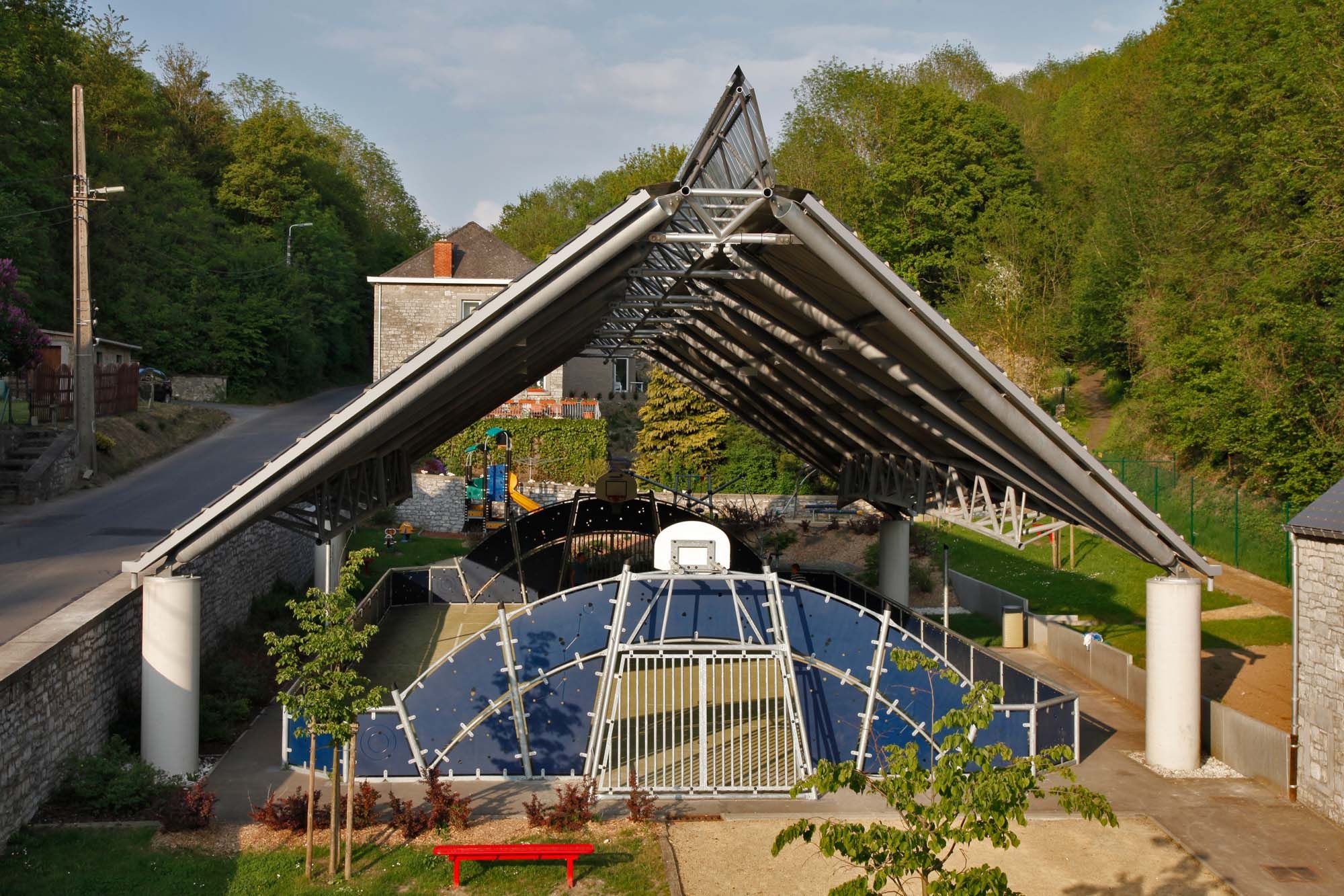 L’espace multisport de Thon est un projet de requalification d’un espace communal existant en lieu de rencontre sportive intergénérationnel. Le parti retenu est une charpente légère, posée sur la pointe de ses trépieds inversés. L’équilibre général est obtenu en opposant dans chacune des directions principales deux trépieds pour équilibrer les tendances au basculement. La tension interne dans la charpente est mise en exergue par la présence des arcs tridimensionnels qui relient, en partie inférieure, les appuis sur la plus grande portée. La structure de l’auvent est constituée de quatre trépieds inversés placés en vis à vis. La panne faitière reliant les deux portiques est une poutre tridimensionnelle qui assure une raideur suffisante à la structure principale. En pied de charpente, deux arcs courbes tridimensionnels sont ‘greffés’ sur l’ossature principale. Ces arbalétriers ont comme fonction d’assurer la stabilité en rotation des poutres en arc et d’assurer un entraxe économique.
