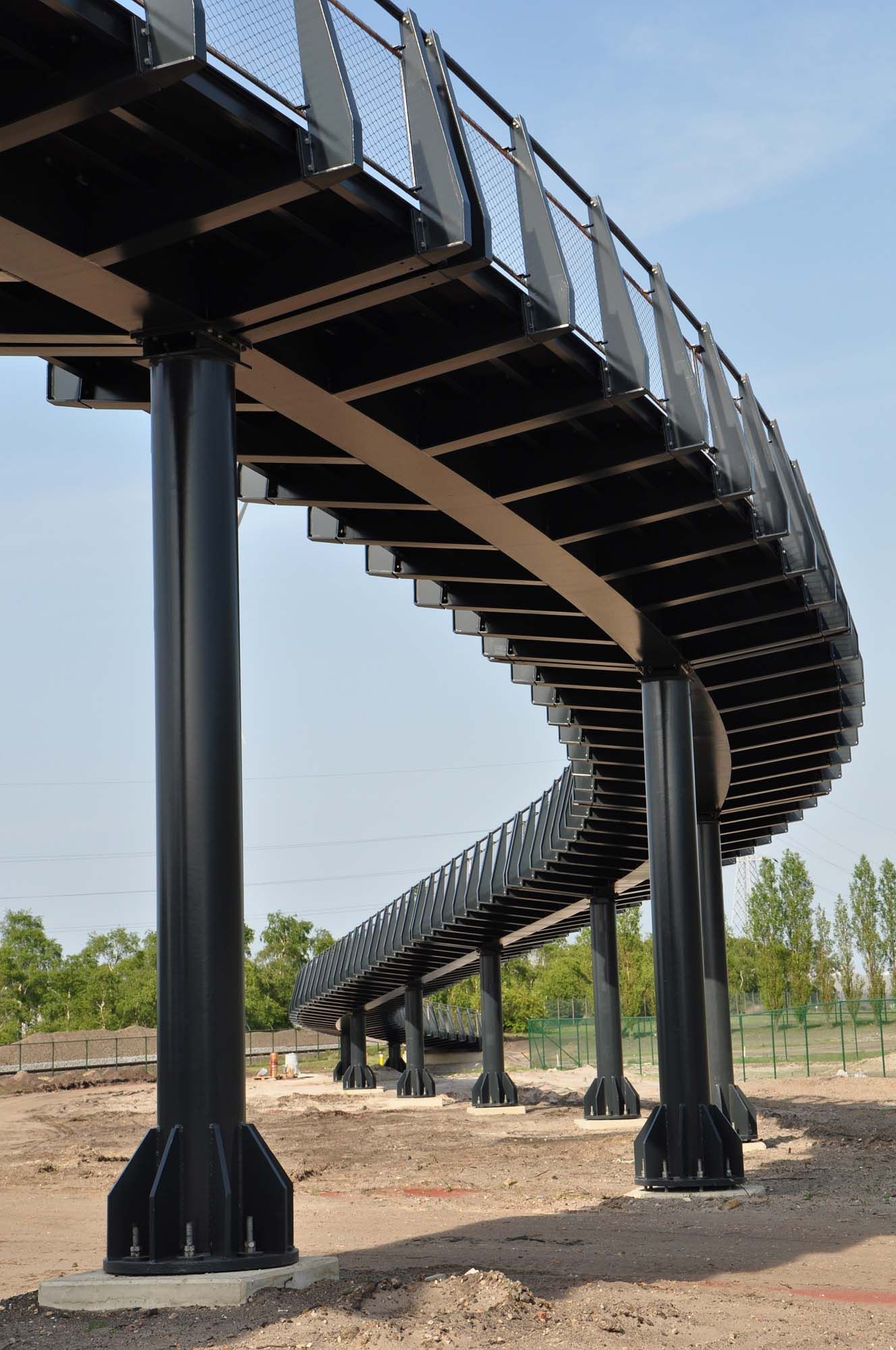 La passerelle est supportée par un profilé creux de 350 x 480 mm en forme de tire-bouchon. Ce caisson est aussi incliné d’un côté pour assurer l’évacuation de l’eau. Il est soutenu par des colonnes en acier faites de tubes ronds d’un diamètre de 508/16. Le tablier est supporté par un réseau de profils IPE 140 et de poutrelles assemblées en cône d’une hauteur allant de 480 mm à 240 mm. Le garde-corps est constitué de tôles de 10 et 15 mm. Enfin, sur ces montants sont fixés des cadres en inox avec un filet en inox.