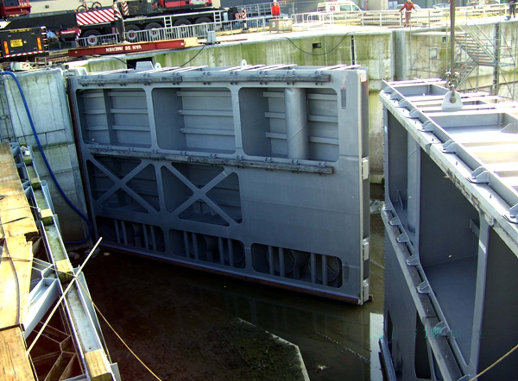 Le complexe d’écluses d’Evergem, près de Gand, est situé sur l’une des voies navigables les plus fréquentées de Belgique. Afin de permettre un trafic sûr et fiable, aussi bien pour le transport que pour la navigation de plaisance, les autorités ont décidé de moderniser les infrastructures existantes. Une partie de la rénovation concerne les 12 portes d’écluses en acier, de type busquées, qui intègrent des caissons. Chaque porte a une hauteur de 8,4 m, une largeur de 14,1 m et pèse 62 tonnes.