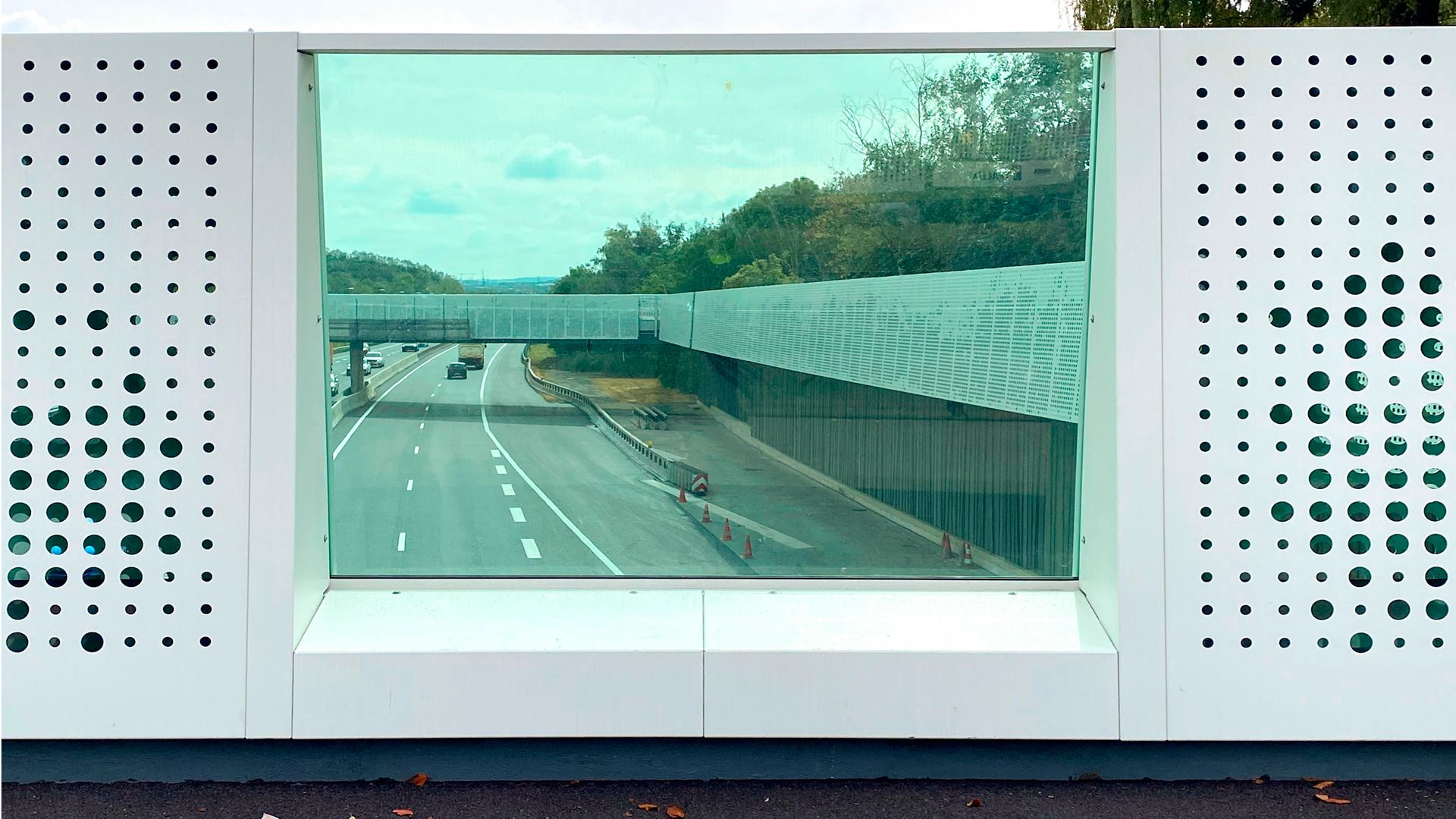 Cet écran acoustique, visible de tous les côtés, se compose de : la structure en acier galvanisé HEA240, les doubles tôles filigranes en aluminium thermolaqué avec les nuages de points autour du plexiglas soundstop teinté vert pour réfléchir le son. En partie basse les panneaux absorbants sont perforés. Au niveau inférieur de l’autoroute, les panneaux striés verticalement sont en béton acoustique de teinte naturelle. Le motif des stries et des points est inspiré de la nature avoisinante, conceptualisée et dématérialisée au maximum.