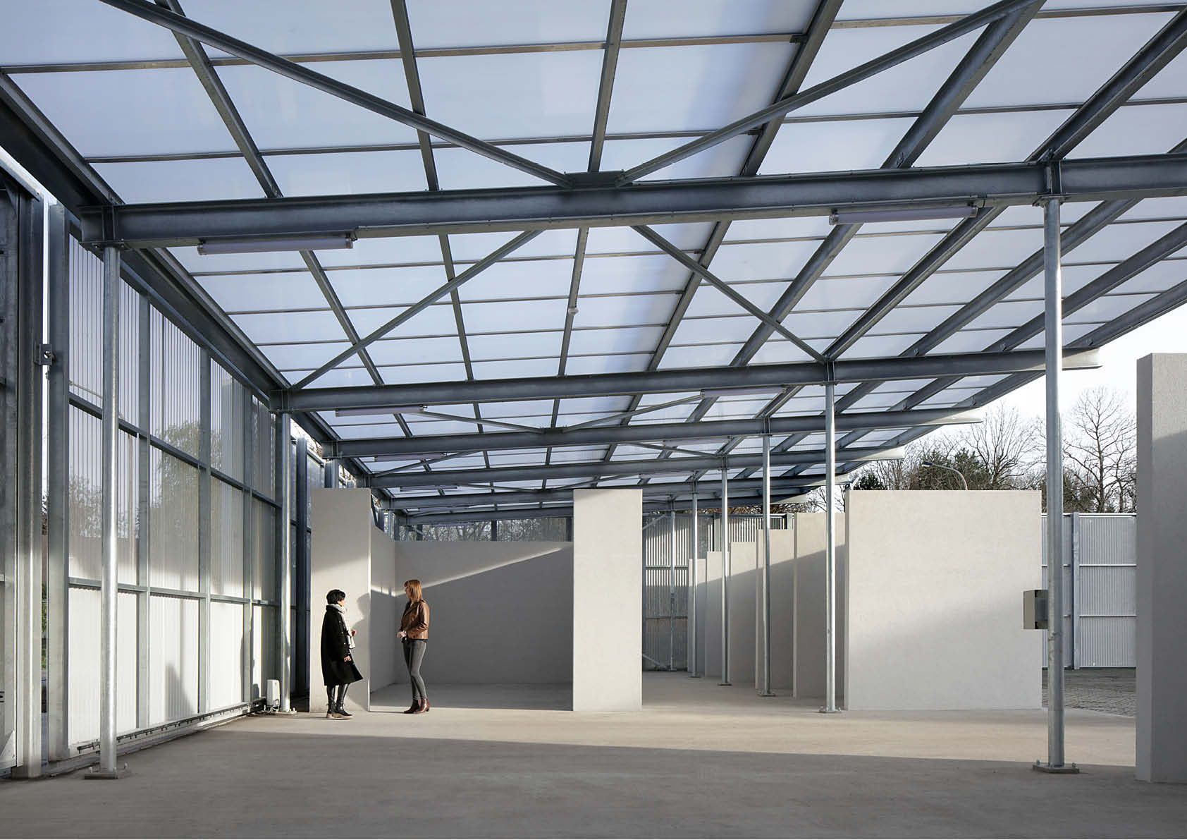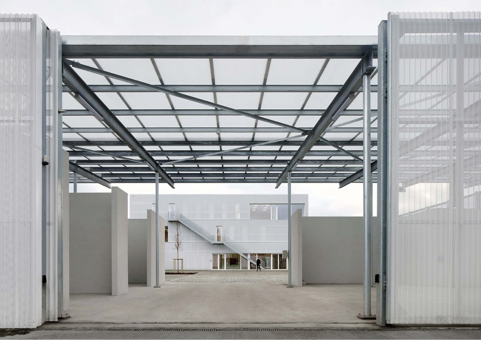 Het gebruik van S255- en S355-staal bood een grote vrijheid qua vorm, textuur en toepassing. De gevels zijn afgewerkt met een aluminium beplating op een frame in gegalvaniseerd staal. Natuurlijk licht wekt het gebouw tot leven, naargelang het tijdstip van de dag, en speelt met de geplooide, glanzende en geperforeerde textuur van de aluminiumbekleding. Binnen is een monumentale wenteltrap in wit gepoedercoat staal gerealiseerd, die de abstracte esthetiek van de gebouwschil herneemt.