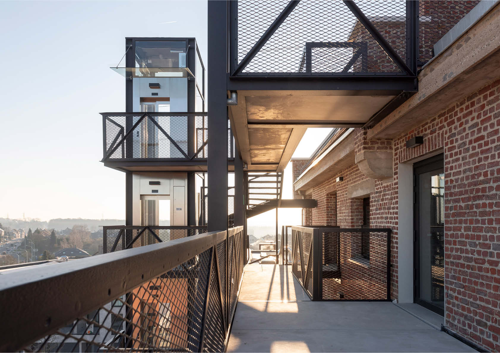 De uitdaging bestond erin deze robuuste gegalvaniseerde S235JR-constructie toch ook elegant te houden en een antwoord te bieden op het vlak van waterhuishouding. Zo zijn de goten en waterafvoeren zorgvuldig geïntegreerd in de horizontale en verticale profielen. De passerelles kregen een poedercoating in dezelfde RAL-kleur als het schrijnwerk. De borstweringen werken als vierendeelliggers met schuine verbindingen, waardoor de passerelles grotere overspanningen kunnen overbruggen. De openingen tussen de structuur van de borstweringen zijn ingevuld met strekmetalen vlakken.