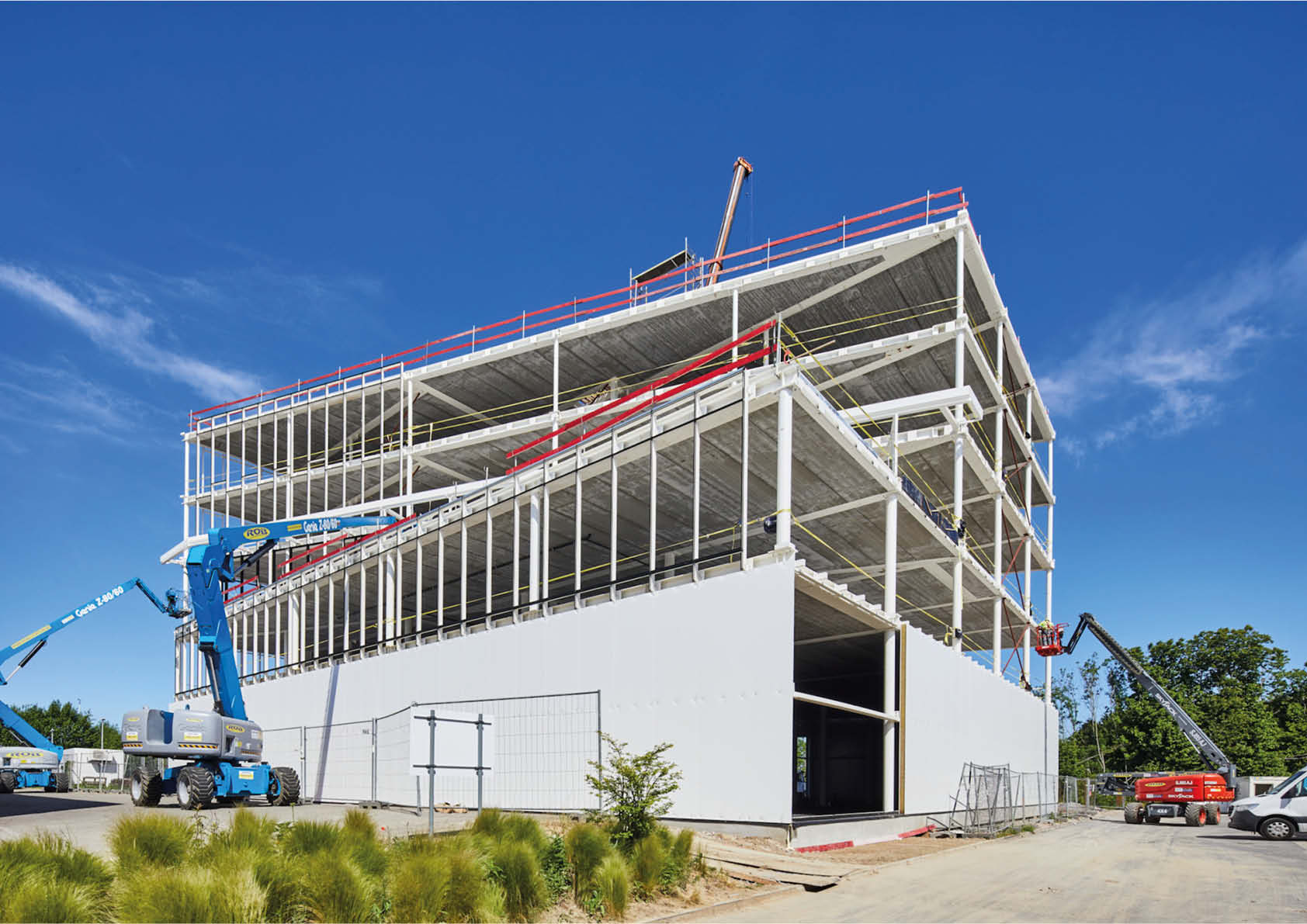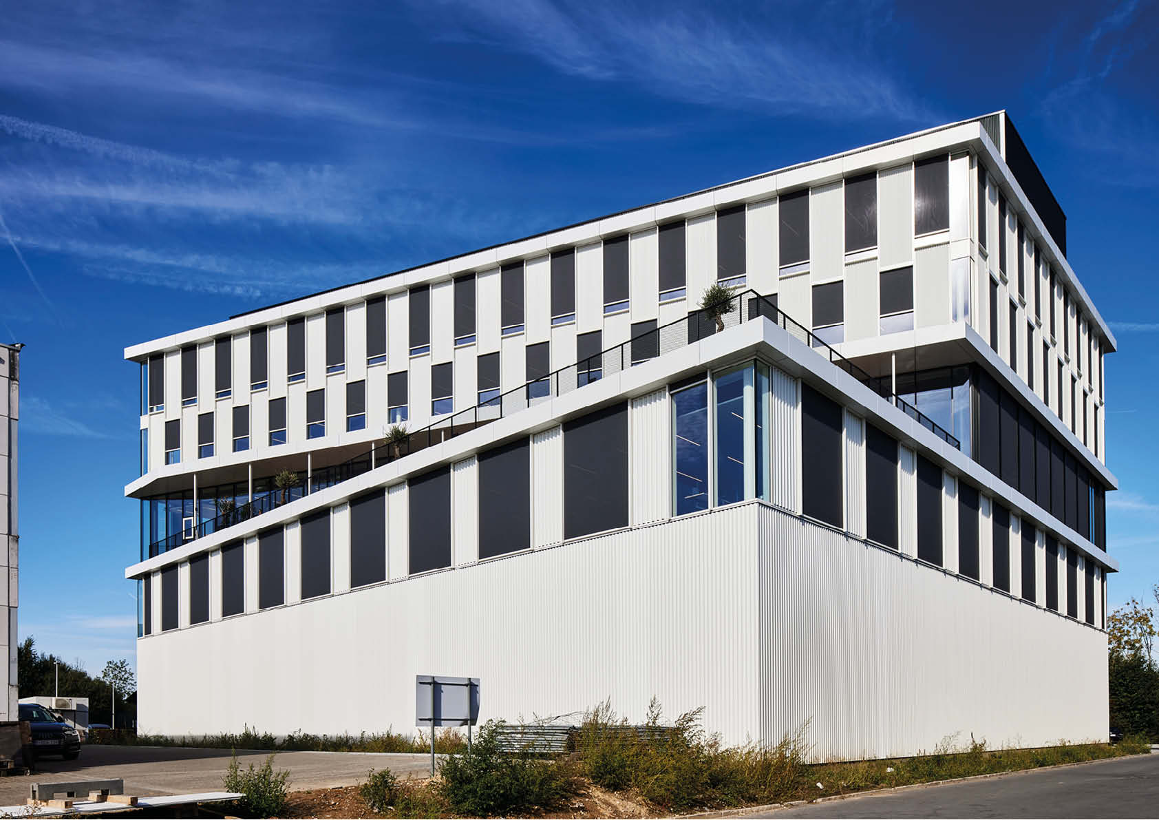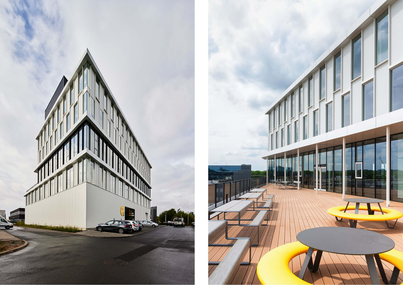 Het plan van het gebouw gaat uit van een maximaal open structuur. De architecturale volumewerking van dit meerlagig concept is duidelijk zichtbaar. Er zijn vier verschillende lagen. De gelijkvloerse verdieping is een gesloten hal met witgelakte stalen golfplaten gemonteerd op rotswolpanelen. De lagen erboven zijn kantoorruimtes en zijn afzonderlijk leesbaar door de ritmeringen van de vliesgevels.