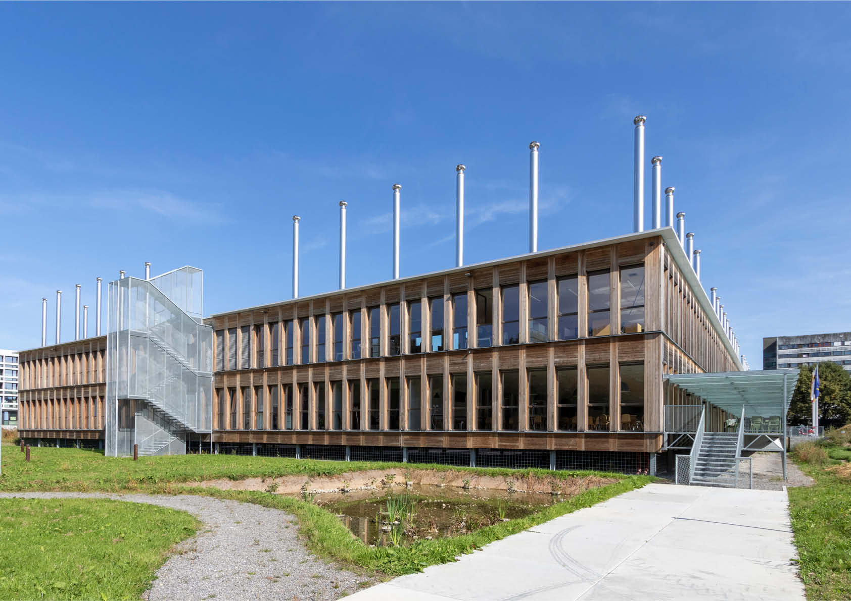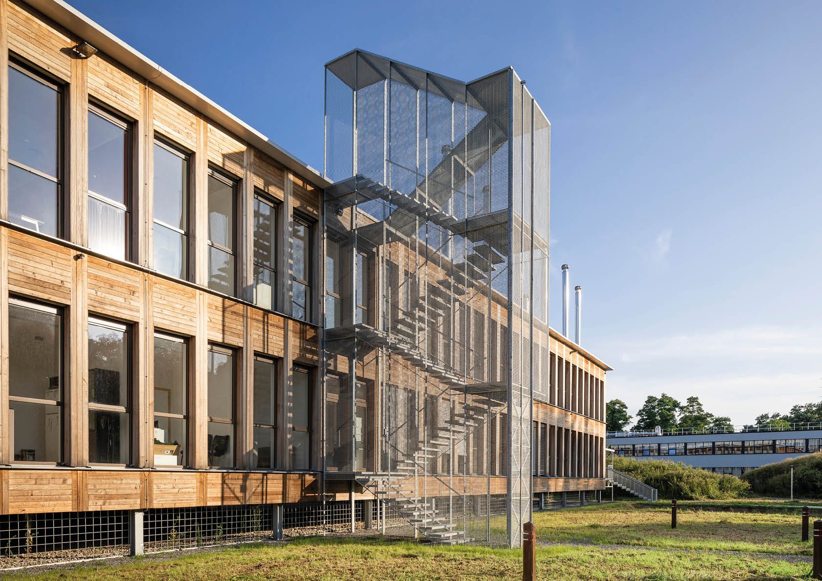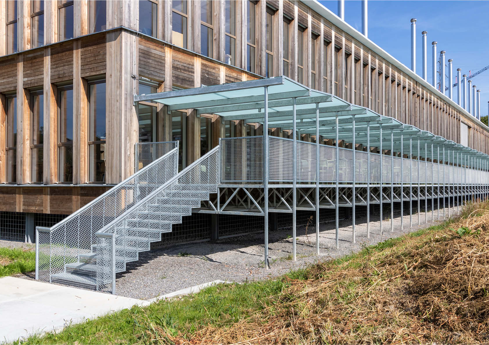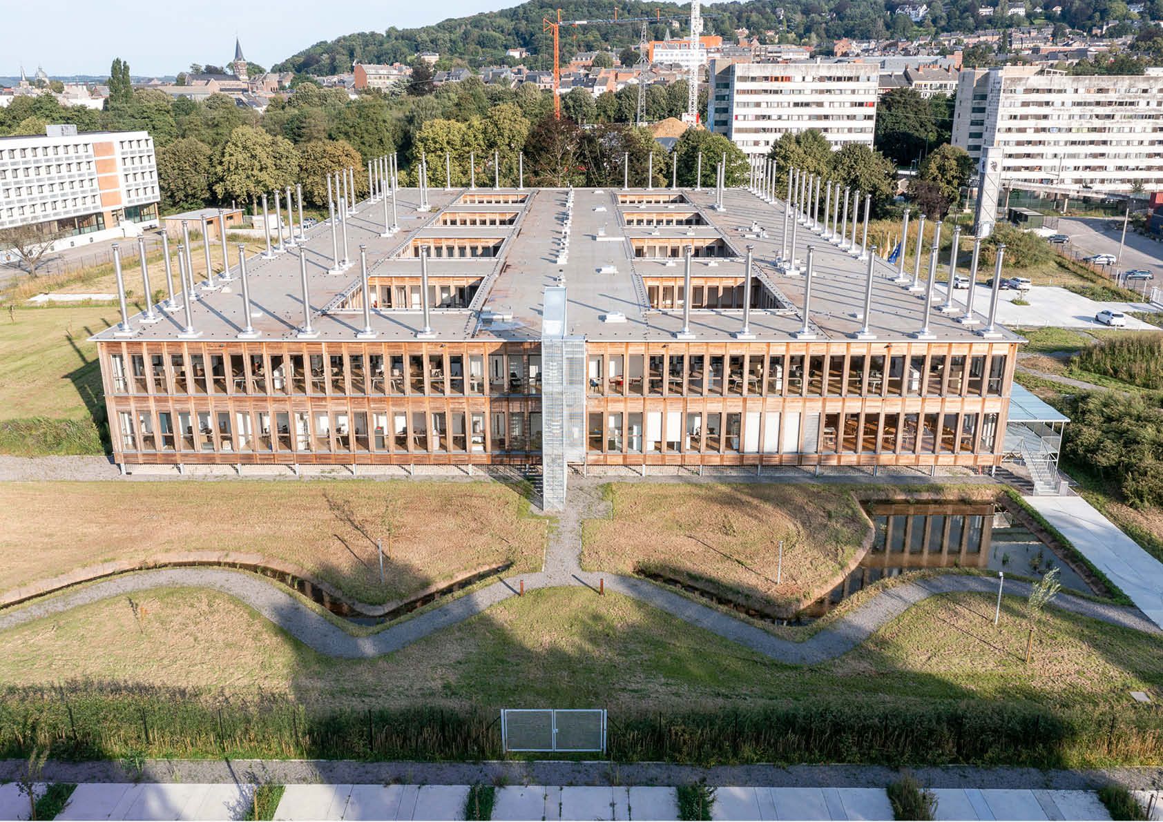 Om haar diensten op één site te centraliseren, liet de provincie Namen een nieuwe hoofdzetel optrekken in hout en staal. Het rechthoekige houten gebouw is op palen in gegalvaniseerd staal geplaatst. Er is ook staal gebruikt voor een aantal elementen die aan het gebouw verankerd zijn, met name de brede buitengang in traanplaten en de beglaasde luifel die de volledige voorgevel bestrijkt. De buitenlift en -passerelle bestaan uit gelaste modules in gewalste profielen (L, T en HEA) en zijn thermisch verzinkt. De traptoren die de externe noodtrap omhult, is bekleed met panelen in geperforeerd Magnelis®-plaatstaal, wat bijdraagt tot de uitgesproken transparantie van deze structuur.