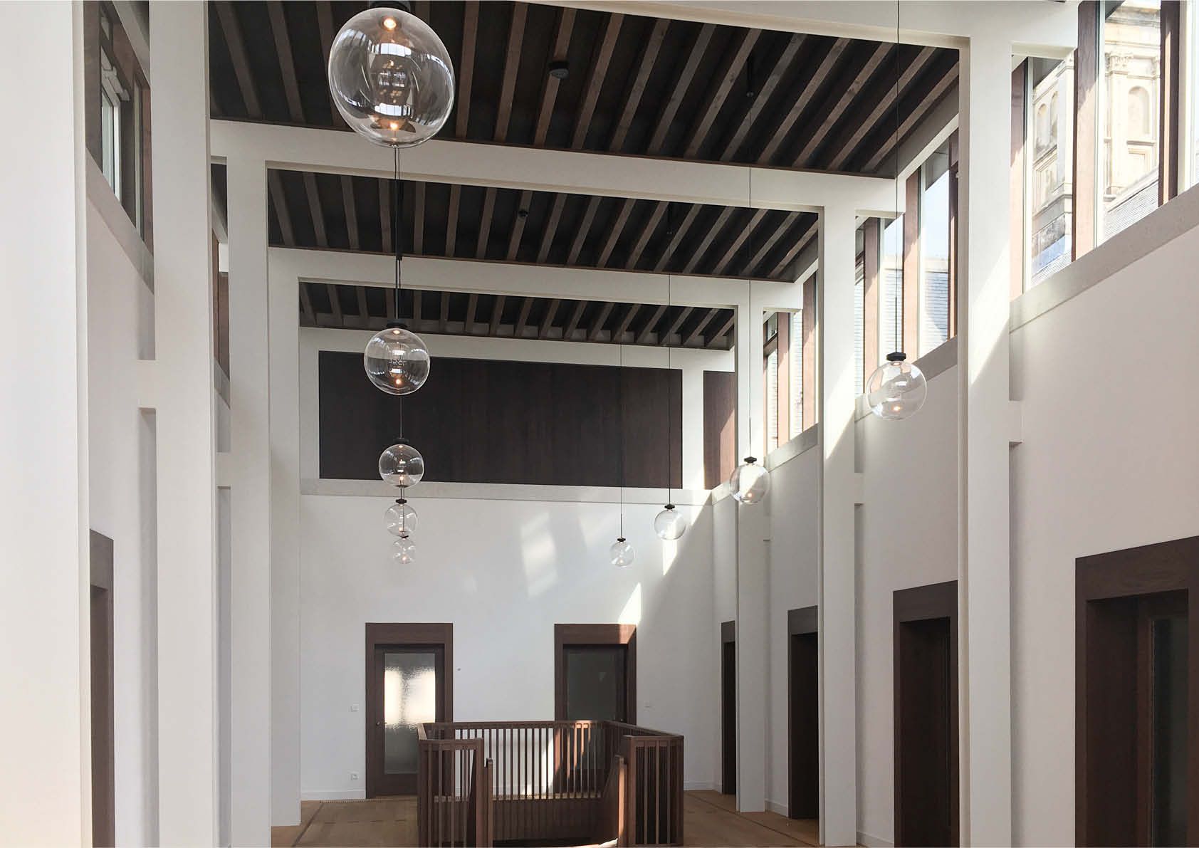 Deze vestibules zijn dubbelhoge ruimtes die voor een genereuze lichtinval zorgen. Hiervoor werden twee delen van het bestaande dak verwijderd en vervangen door een lichte staalstructuur. Rechthoekige portieken werden aangebracht. Ze zijn zichtbaar in de ruimte en staan los van de bestaande muren, waardoor ze de gelaagdheid van het gebouw en van de ingreep accentueren.