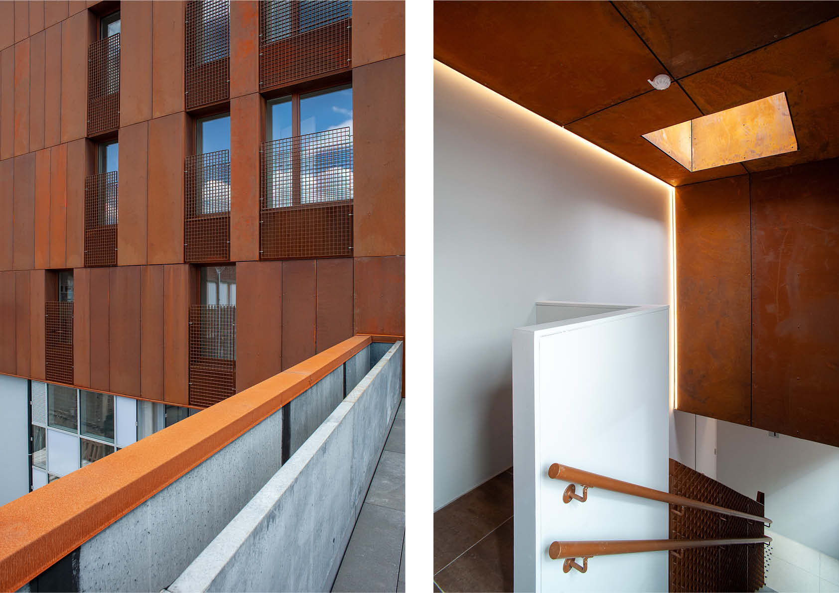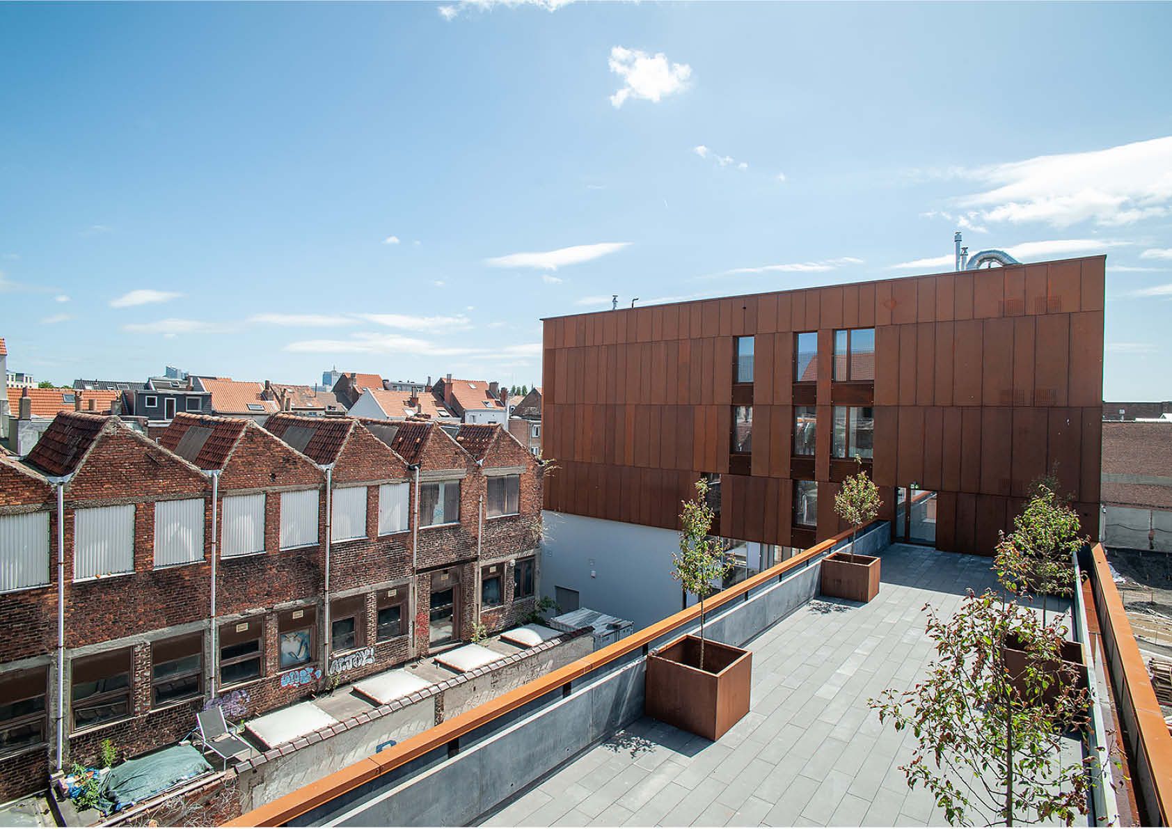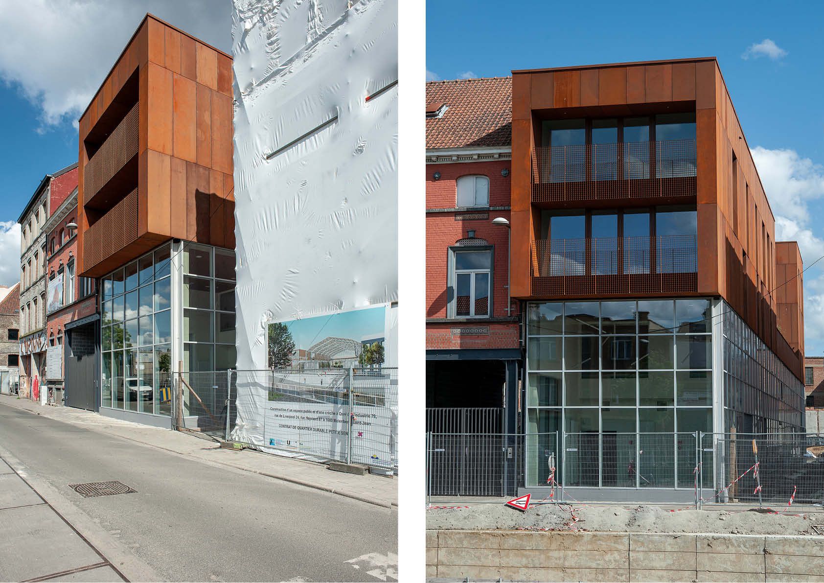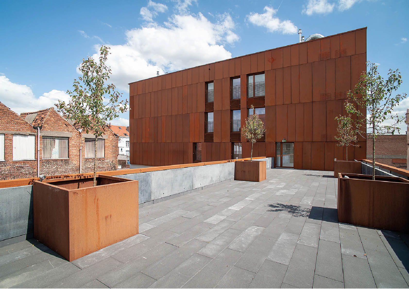 In het kader van Duurzaam Wijkcontract ‘Zinneke’ krijgt een industriële site in hartje Molenbeek een tweede leven. Het complex zal plaats bieden aan ateliers, intergenerationele woningen en een wintertuin. Het bovenste register combineert glazen ramen en 2 mm dikke cortenstaalplaten (982 m² in totaal). Het roodbruine staal past uitstekend in de architectonische omgeving, die gekenmerkt wordt door bakstenen en dakpannen in dezelfde tint. Het materiaal verwijst ook naar het industriële verleden van de wijk. Ten slotte heeft cortenstaal ook enkele waardevolle praktische voordelen, vermits het geen verdere bescherming tegen corrosie vereist. Bovendien kan het gebruik van verf verminderd of vermeden worden dankzij de beschermende oxidelaag.